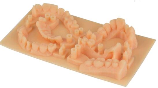 因此我們不能說光敏樹脂是某種化學(xué)物質(zhì),它在不同的配比之后3D打印能夠得到類似ABS、尼龍等工程塑料材質(zhì)的樣品而物理性能更佳,甚至可以作為試制注塑模具。另外樹脂的性能決定了它的應(yīng)用方向,石蠟樹脂通常作為珠寶首飾的陰模,用于首飾鑄造;牙科樹脂則用于復(fù)原牙床結(jié)構(gòu),制作義齒。